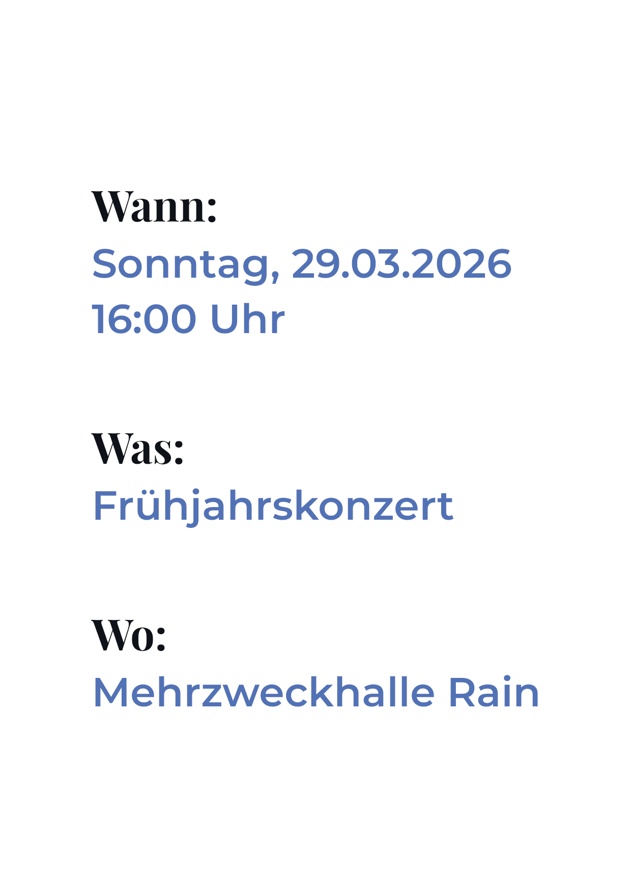 Die Musikproben finden jeden Montag im Musikheim am Sportplatz in Rain statt.